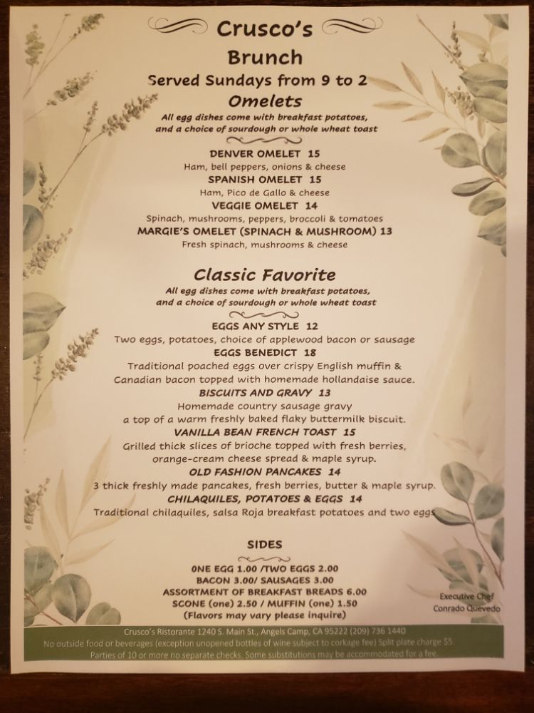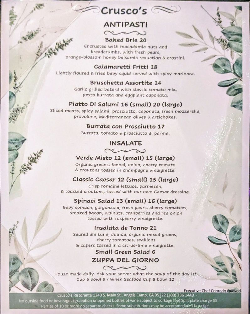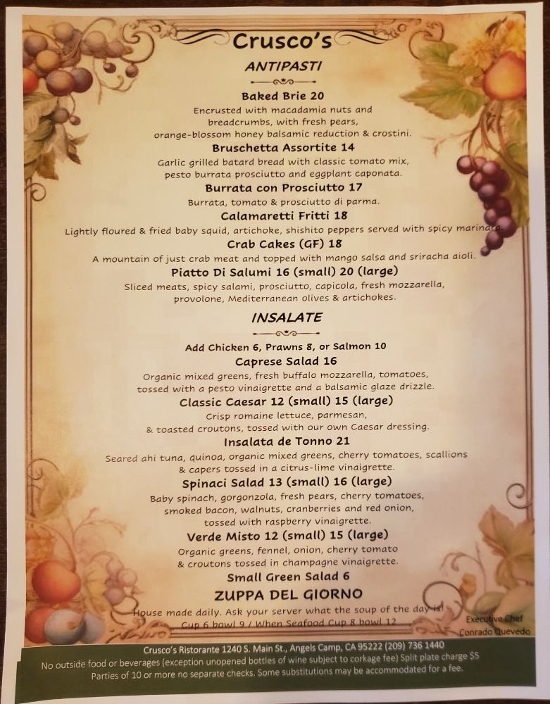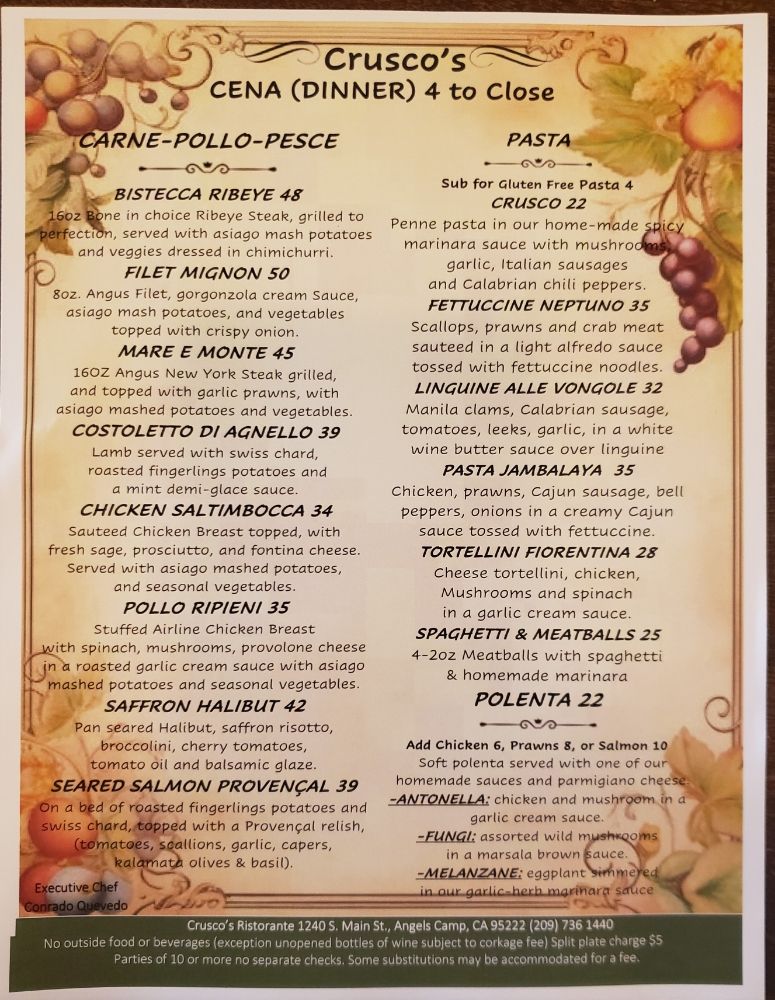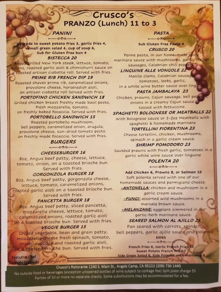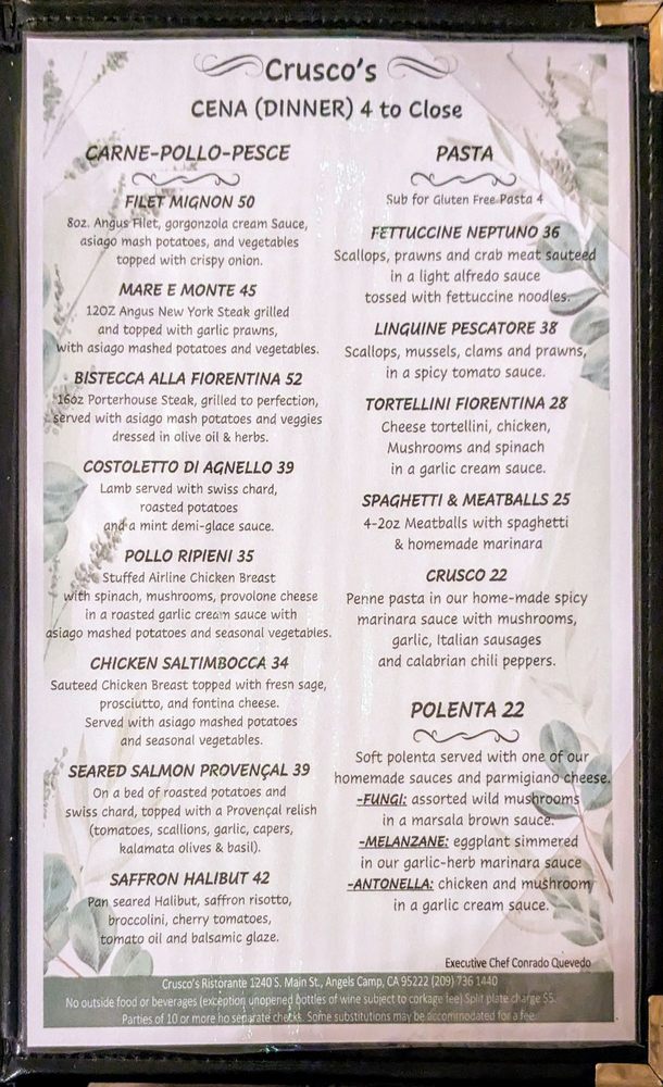 Crusco’s, a blend of American and Italian flavors with a touch of salad offerings, stands out for its intimate, classy ambiance and excellent service. Located in Angels Camp, CA, this restaurant offers a variety of options, including vegan dishes, outdoor seating, and Wi-Fi access. The menu showcases delectable options such as Filetto Col Granchio, Mare E Monte, Crusco penne pasta, and Wild Alaskan Salmon for dinner. For lunch, try the Gorgonzola Burger or the New York Steak Sandwich. Indulge in housemade desserts like Panna Cotta or Kaluha Chocolate Mousse. Customers rave about the exceptional service and outstanding dishes like the Halibut and Neptune Fettucine. Whether for a date night or a casual meal, Crusco’s offers a delightful dining experience.